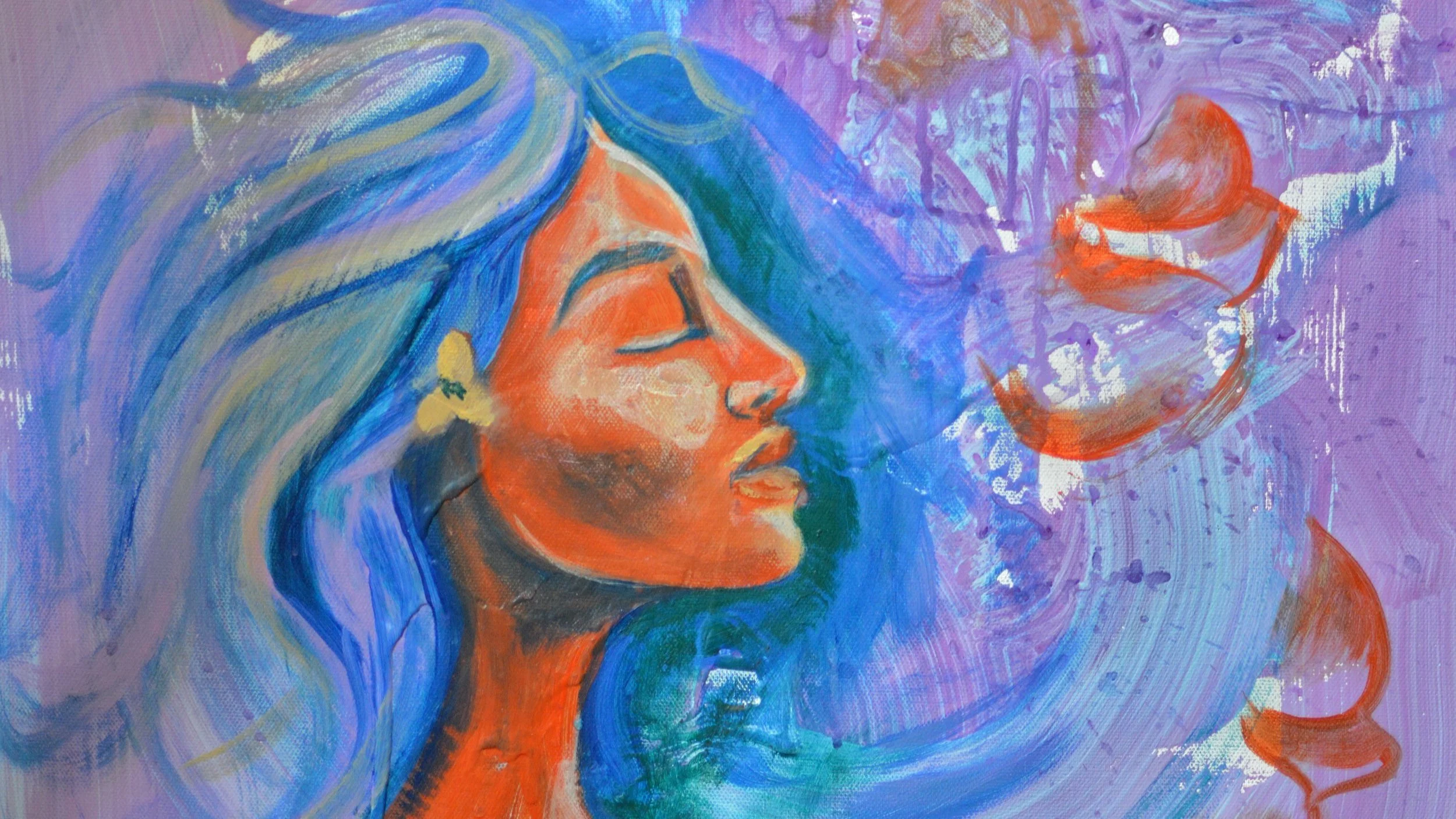 Inhale Softness is a portrait of surrender and stillness, an invitation to breathe deeply, let go, and trust the flow. With a dreamy palette of violets, sea-blues, and sun-warmed oranges, this painting evokes a quiet moment of spiritual clarity and emotional freedom.