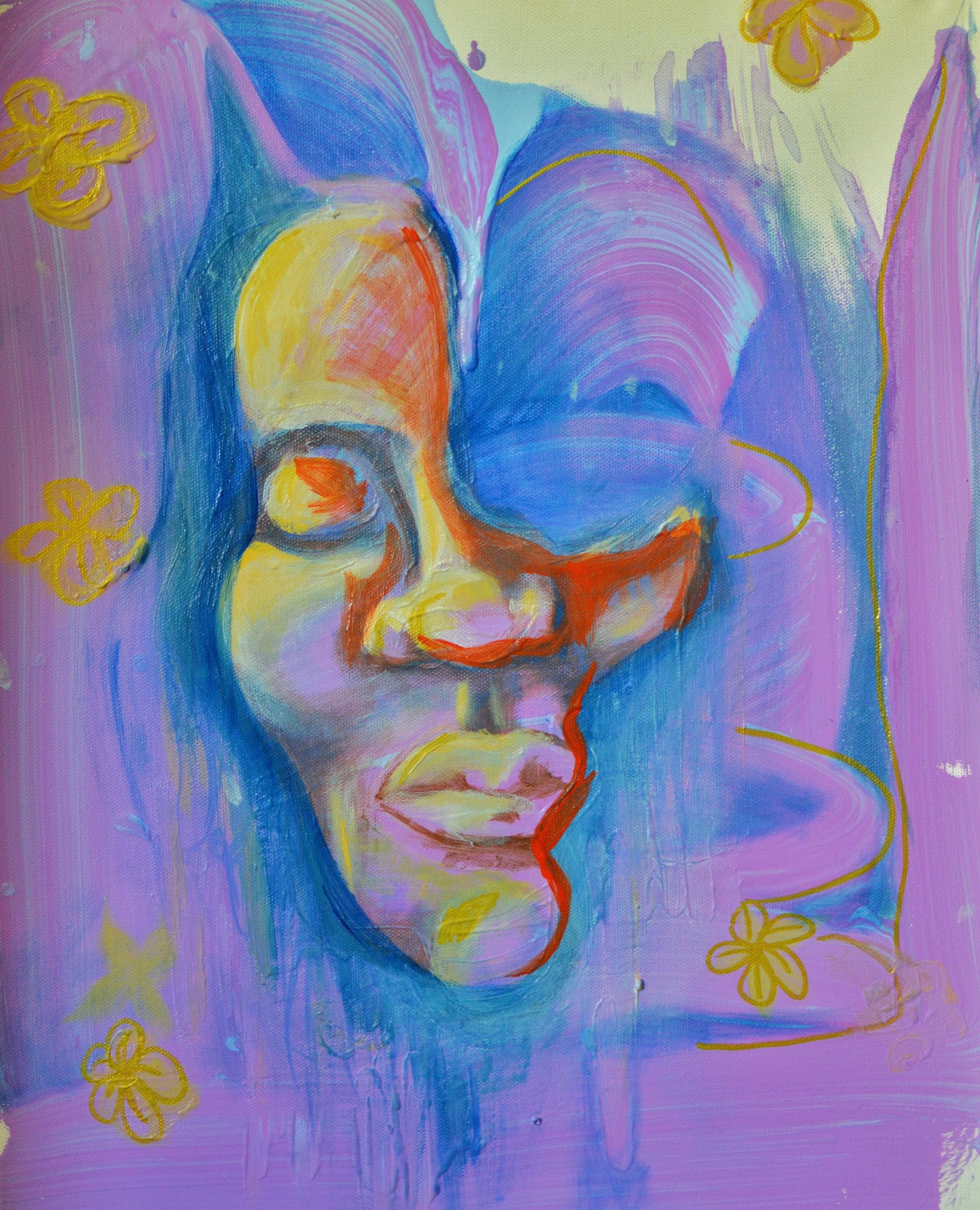 A radiant exploration of identity, Golden Within invites us to consider the light we carry beneath the surface. With abstract features emerging through bold color, this portrait is both playful and profound—framed by golden blooms and soft, swirling layers of lilac and blue.
